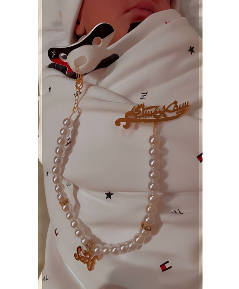 بروش اطفال منحوت السيف واعلاة الاسم اللي تبي مع عقد من اللؤلؤ ينتهي بسلسال صغير مع القفل الذي يعمل على الاحتفاظ باللهاية الخاصة بالطفل تصميم حديث ومميز مطلي بالذهب او الفضة يناسب جميع الاعمار
