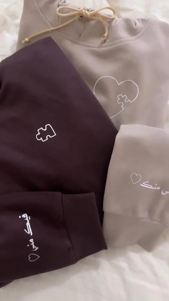 تم تصميم هذا الهودي بعناية ليكون أكثر من مجرد قطعة ملابس، إنه رسالة شخصية تحمل بين طياتها مشاعر خاصة. اختر من بين النصوص الجاهزة مثل فيني منك أو فيك مني، أو اكتب عبارتك المخصصة التي تعبر عنك. مع إمكانية إضافة رسالة جانبية على الكم تضفي لمسة شخصية لا تُنسى. مصنوع من قماش قطني ناعم وعالي الجودة يمنحك الراحة والدفء طوال اليوم. يأتي بتغليف فاخر مع بطاقة مخصصة، مما يجعله هدية مثالية تُحفر في الذاكرة.